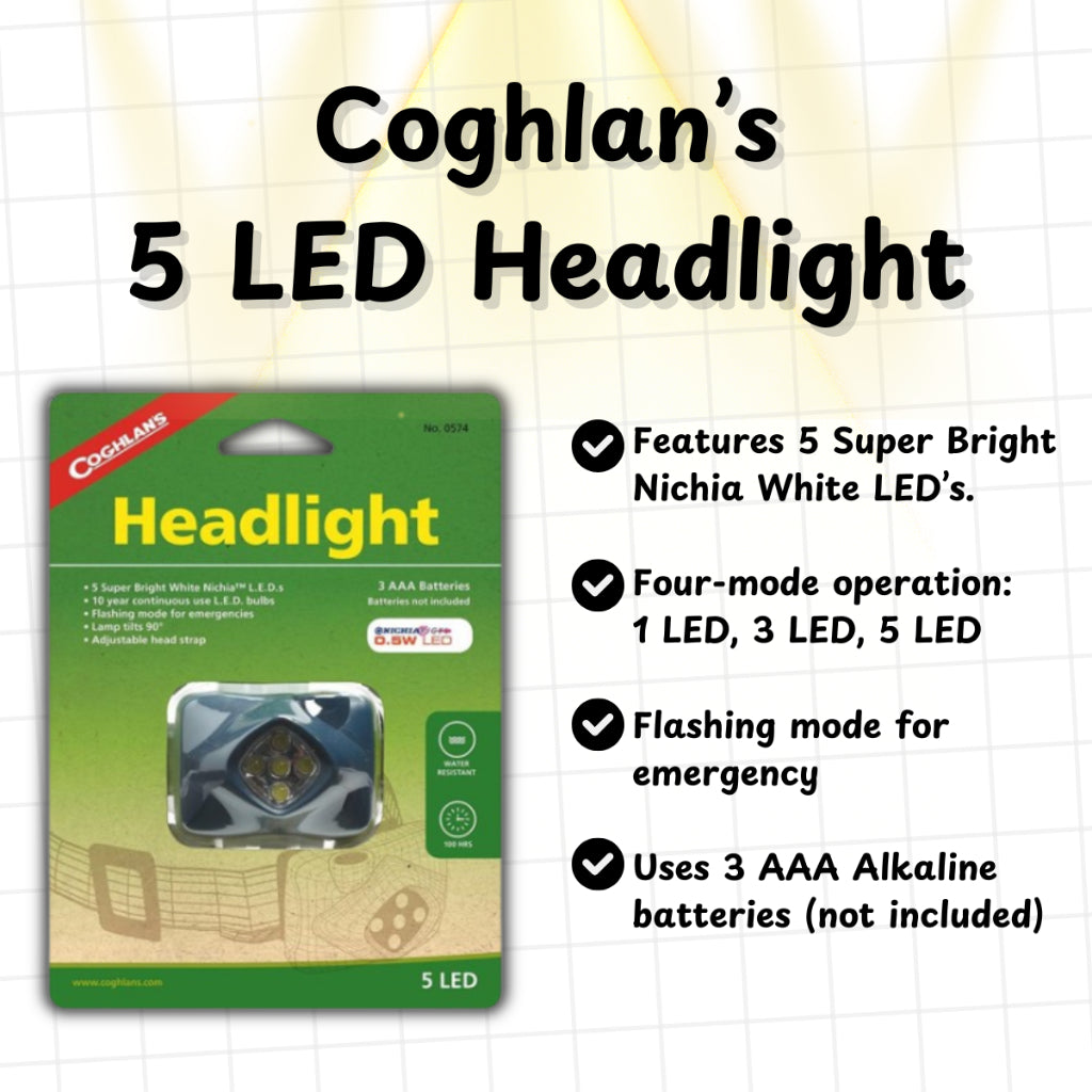 Features 5 Super Bright Nichia White LED’s. Four-mode operation: 1 LED, 3 LED, 5 LED and Flashing mode for emergency. Adjustable inclination and head strap. Uses 3 AAA Alkaline batteries (not included) Estimated battery life: 100 hours using 1 LED; 35 hours using 3 LED 25 hours using 5 LED; 68 hours Flashing.