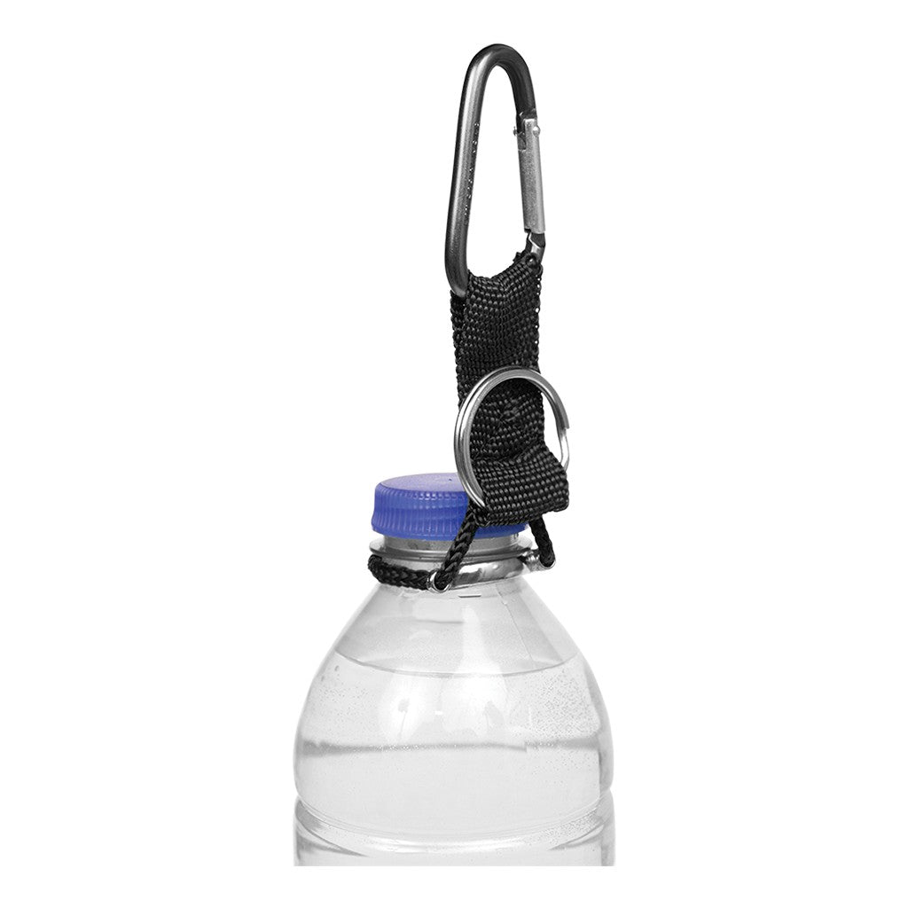 Featuring a metal locking collar with cord loop, the carrier fits around the neck of any bottle up to 1.25" wide and includes a carabiner and key ring for easy attachment.