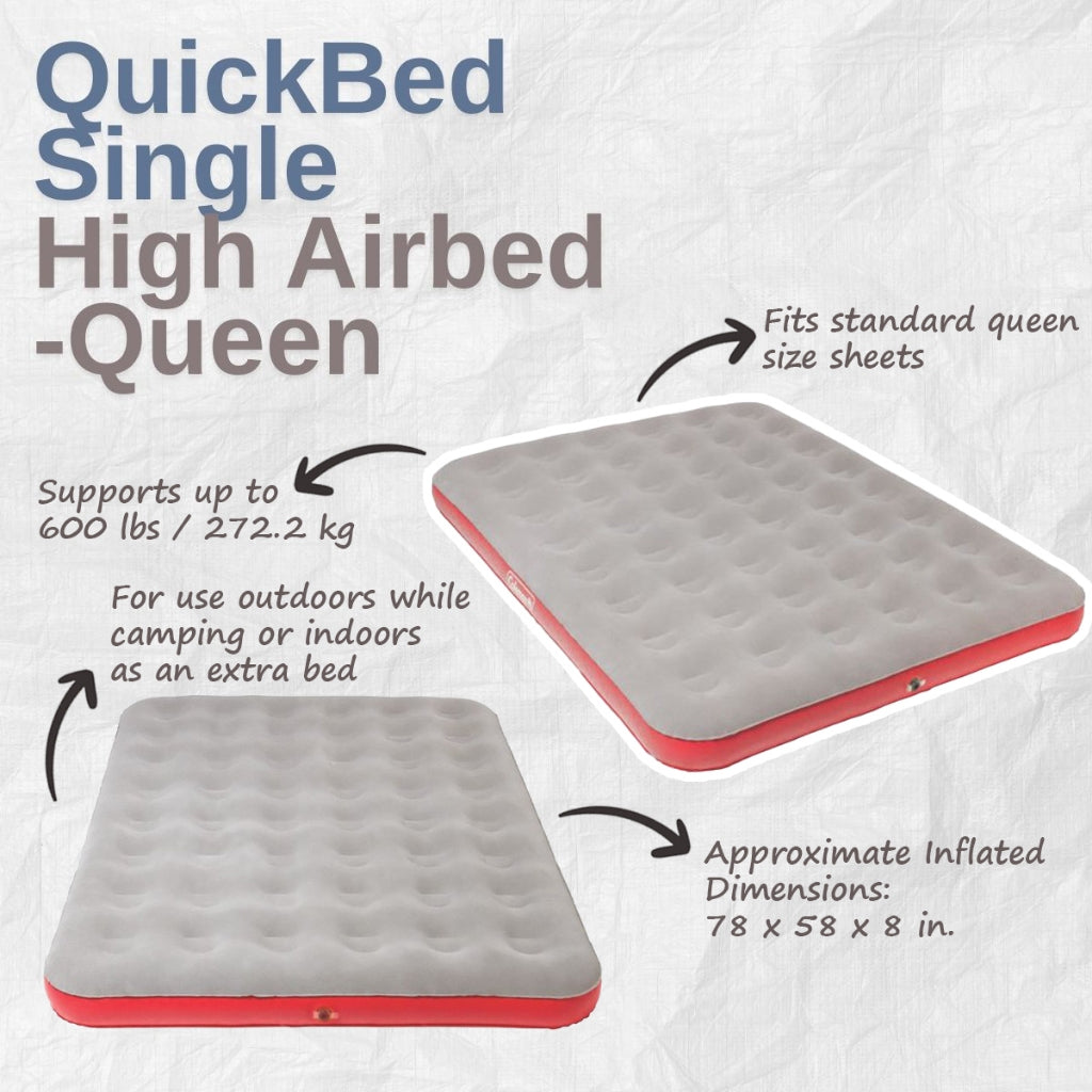 Get a restful night's sleep in your home or tent with a Coleman® QuickBed® Single High Airbed. The antimicrobial treated sleep surface resists odor, mold, mildew and fungus on the product, so you can offer a bed to your friends and family with confidence. Grab your favorite Coleman® airbed pump, and you'll always be ready to inflate your bed, indoors or outdoors. Once you find the perfect firmness, the AirTight® system will help keep it there, since it's factory-tested to be leak-free. The ComfortStrong™ coil construction provides better support, while a soft top offers relaxation for sleepers on the go.