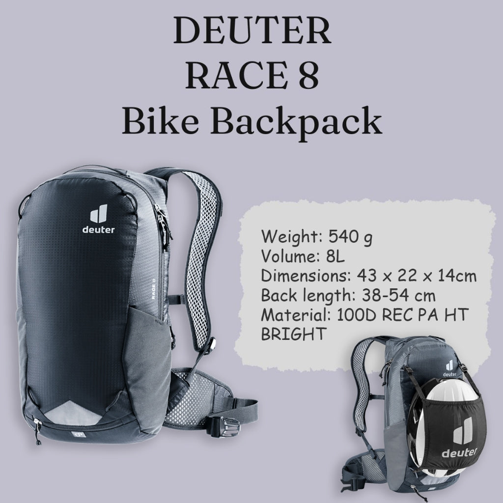 This pared down bike backpack with good weight-to-comfort ratio benefits from the breathable deuter Airstripes back system. Providing athletic mountain bikers with good airflow across the back and a snug fit for technical trails. A sternum strap and mesh hip fins give the pack additional stability. With bluesign® approved body fabric made of 100% recycled materials and components made using environmentally friendly, resource-efficient manufacturing practices, the Race meets the highest environmental standards and is climate neutral, and PFC free.