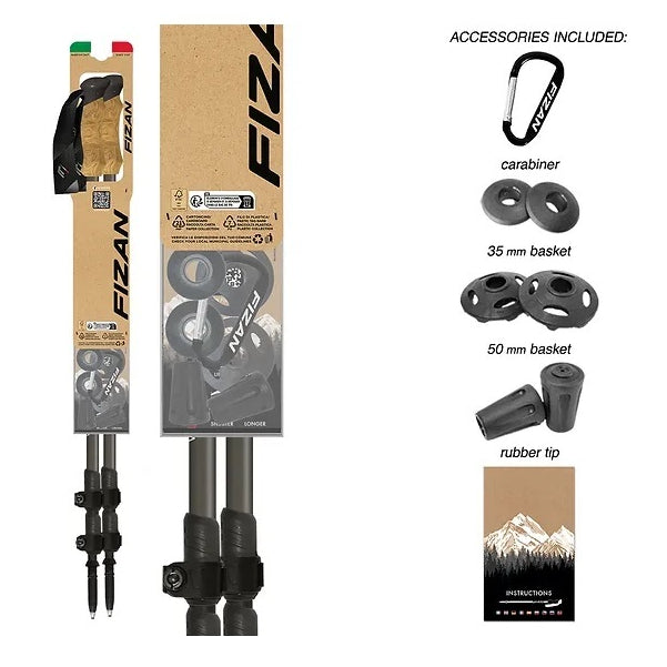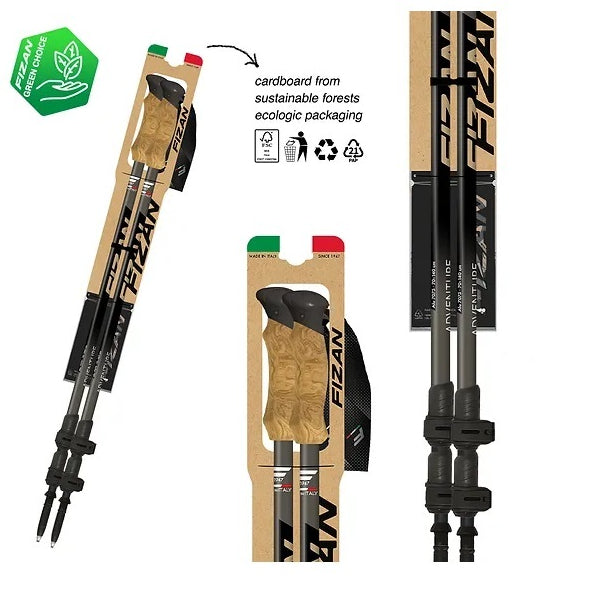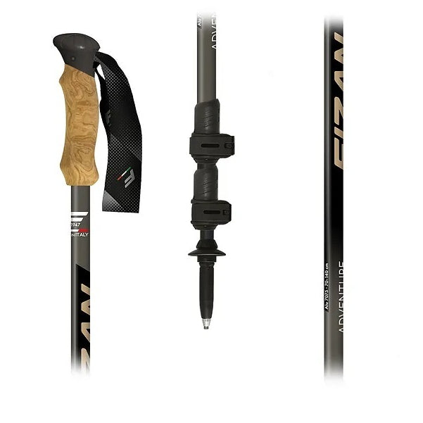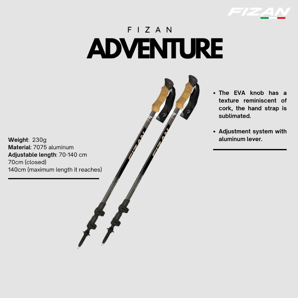 Adventure, 7075 aluminum pole divided into three sections with a diameter of 18/16/14 mm. 70 cm when closed and when fully opened it measures 140 cm. Adjustment system with aluminum lever. The EVA knob has a texture reminiscent of cork, the hand strap is sublimated. Attractive dark gray sublimated graphics and details that recall the color of the knob. The carbide tip is very resistant. The stick comes equipped with spare wheels and tip caps.