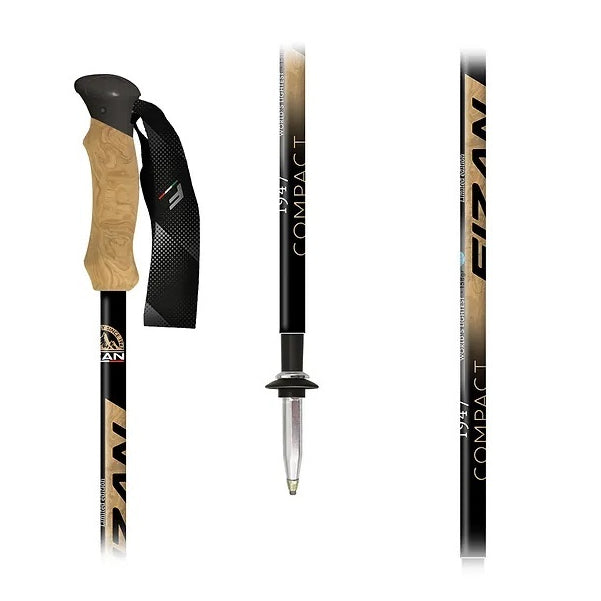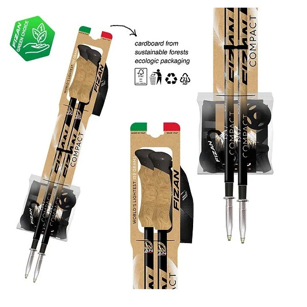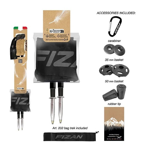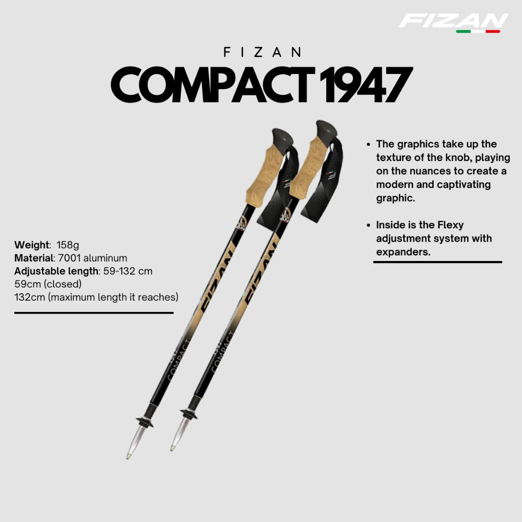 Compact 1947, a stick created to celebrate the year the Fizan company began. A retro but at the same time modern design, given by the EVA knob with cork effect and aluminum support with carbide tip. The graphics take up the texture of the knob, playing on the nuances to create a modern and captivating graphic. The old Fizan logo (the one that was there in 1947) is inserted in the upper part to recall this vintage flavor. Like our Compact, the 1947 is a telescopic stick, divided into three sections 17/16/14 mm. Inside is the Flexy adjustment system with expanders. Its dimensions are 59 cm closed and 132 cm at its maximum opening. The accessories present are the two wheels (35 mm and 50 mm), the tip cover caps and the trekking bag for conveniently storing the poles after use (art. 202).