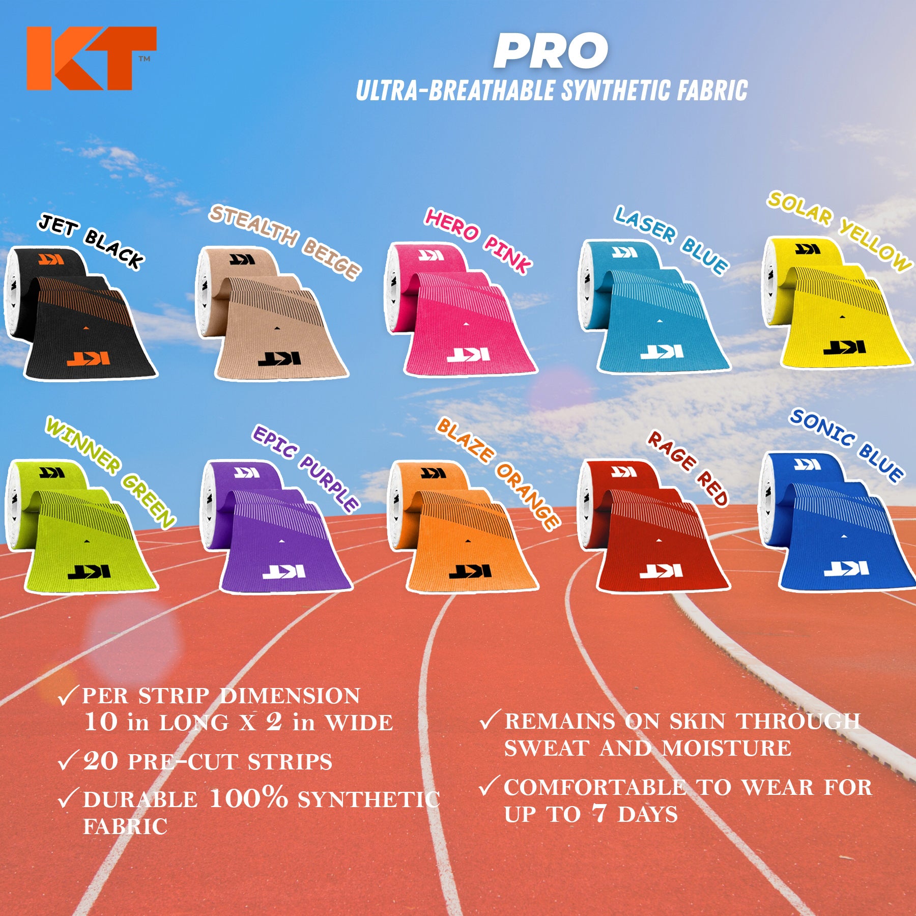 Need support that will endure your toughest workout? KT Tape Pro® is here for you. It has been designed to relieve pain and provide support where you need it, staying in place through multiple workouts. * KT Tape Pro® was created with performance in mind, to work in the harshest environments. It is the world's first 100% synthetic kinesiology tape, re-engineered with stronger adhesive, to outlast anything you can throw at it.