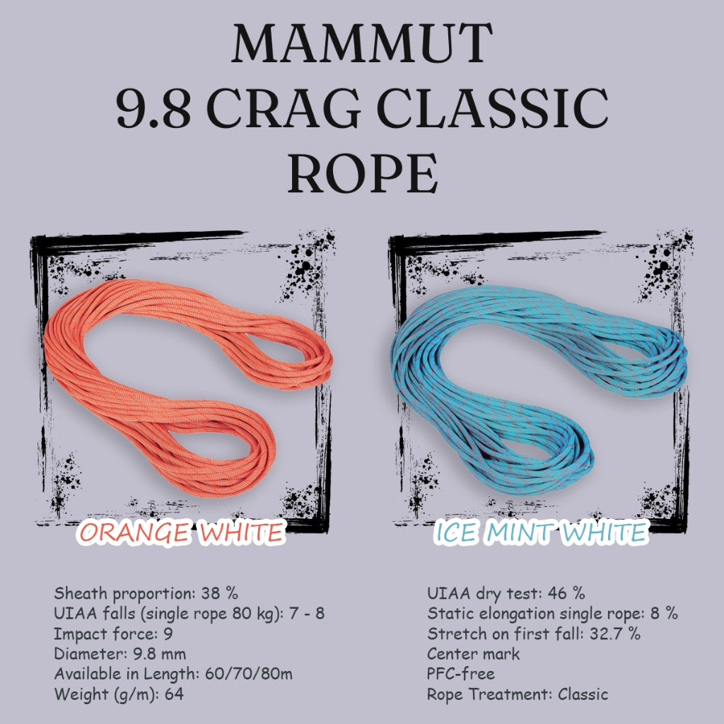 9.8 Crag Classic Rope, a perfect choice for all-around climbers. A high-quality MAMMUT rope for sports climbing and traditional climbing. Excellent handling, the best combination of diameter, weight and reliable durability. The 9.8 Crag Classic Rope is a classic MAMMUT single rope based on the best-selling Eternity.