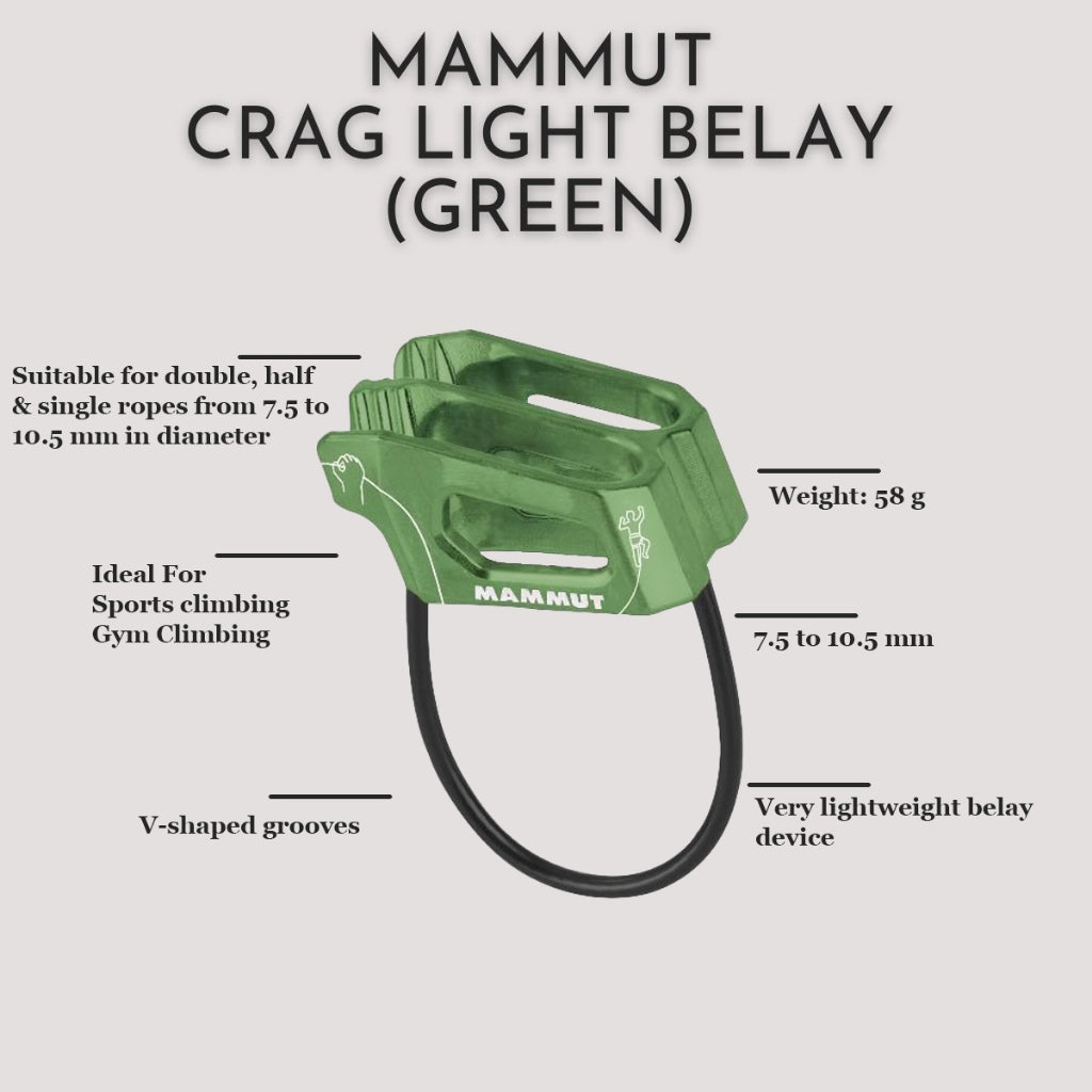Belaying is a technique climbers use to exert tension on a climbing rope so that a falling climber does not fall very far. Belay on the other means a spot where the belayer is anchored, usually a ledge. The Mammut Crag Light Belay device is super lightweight and responsive. It features asymmetrical V-shaped grooved friction channels which adapt the friction on different sized ropes. The belay is suitable for use with double, half and single ropes from 7.5 to 10.5mm. The Crag Light is super lightweight weighing in at 58g. The side walls feature large gaps that act as vents for reducing the heat created by friction. All in all the Crag Light is a really nicely thought out piece of kit that will see you and your climbing partner through some great climbs.