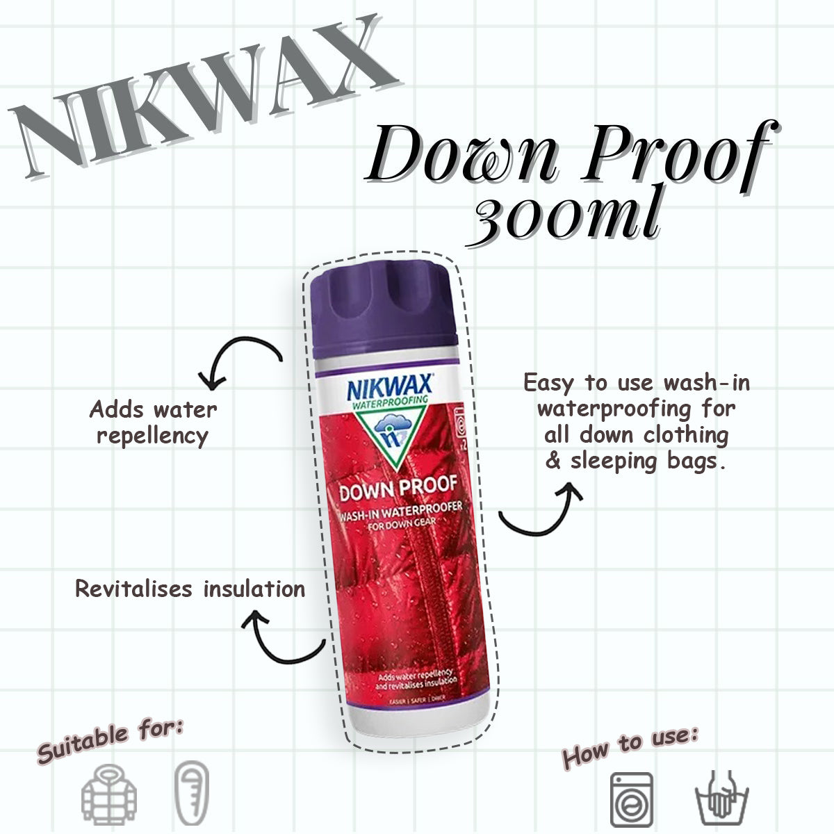 •Nikwax Down Proof™ prolongs the effective life of your down gear. It leaves a flexible water repellent treatment on individual down filaments and fabric fibres allowing moisture vapour to pass through, maintaining breathability and optimising performance in cold and damp conditions.