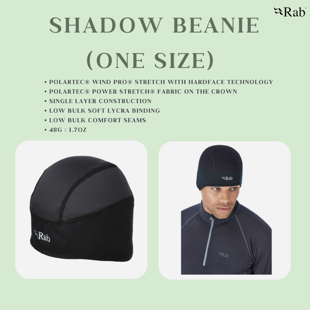 The Shadow Beanie is a wind resistant Polartec® Wind Pro® stretch beanie, with ear protection for all round outdoor use. The Shadow Beanie also features a Polartec® Power Stretch® fabric on the crown for increased comfort. The low-bulk fabric and soft Lycra® binding also makes the Shadow Beanie ideal to wear under hoods or helmets in cold conditions.