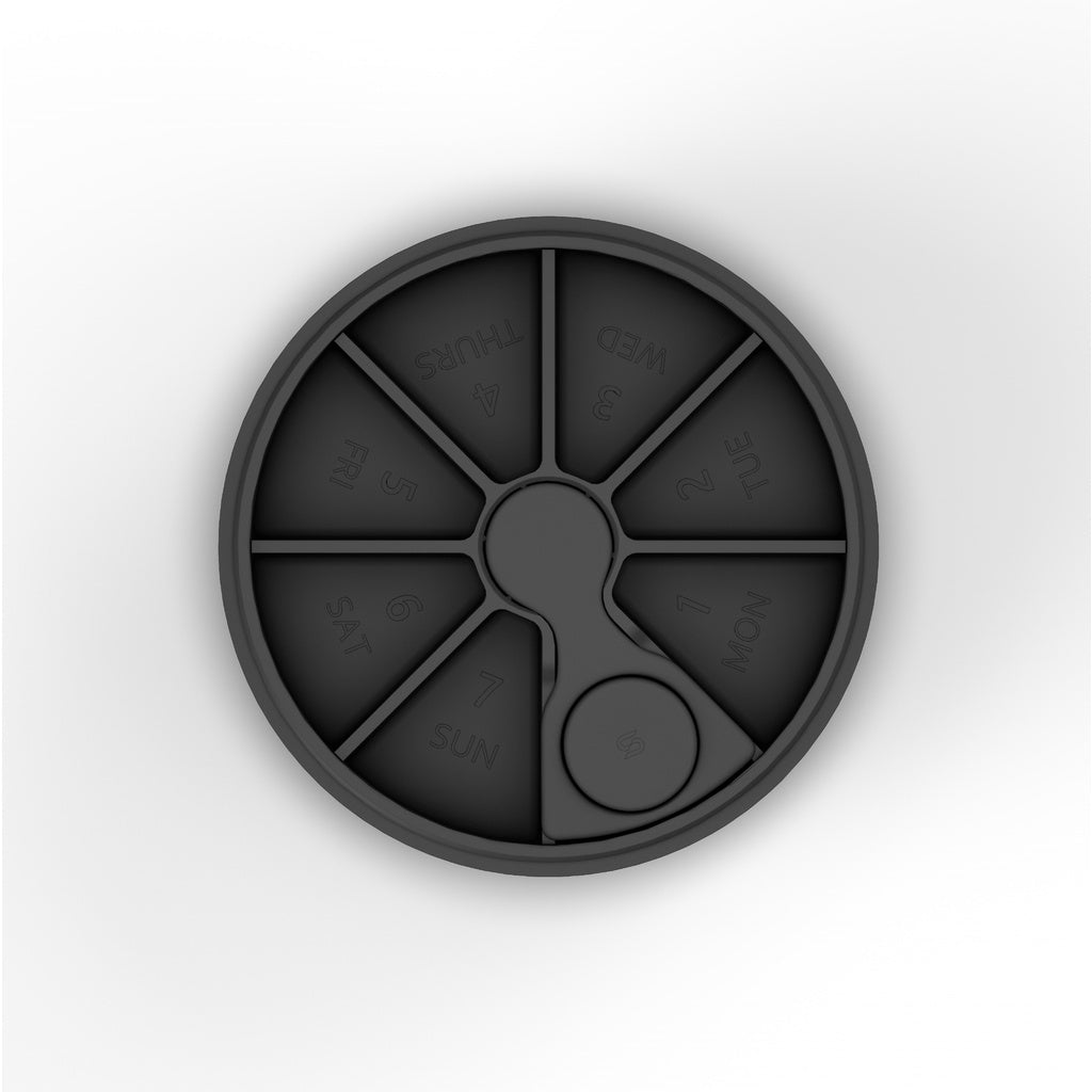 The Magnetic storage snaps 2 together with a powerful magnet. Click button to allow access to the 7 chambers and pressed again to raise up again locking the movement of the rotating upper disc. The upper disc can also pop off to load pills as required.