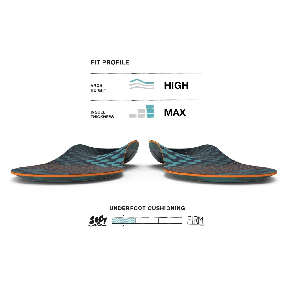 High arch orthotic shape delivers flexible support for any activity; made to fit well in athletic and outdoor footwear.
